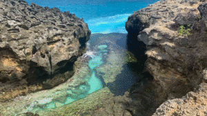 A natural pool with crystal-clear water formed between coral cliffs. At low tide, visitors can see the crystal-clear blue-green water. This spot is renowned as one of the best spots to enjoy the beauty of the ocean up close.