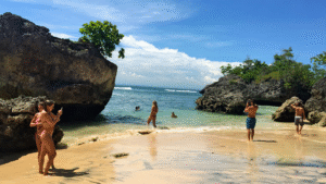 A hidden beach with a peaceful atmosphere and stunning views of the blue sea. To reach it, visitors must pass through a narrow gap between cliffs, providing a unique sense of adventure. This spot is ideal for enjoying the tranquility and natural beauty of southern Bali.