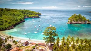 A white sandy tropical beach with crystal clear water, perfect for snorkeling, swimming, or relaxing in the tranquil atmosphere of Nusa Penida.